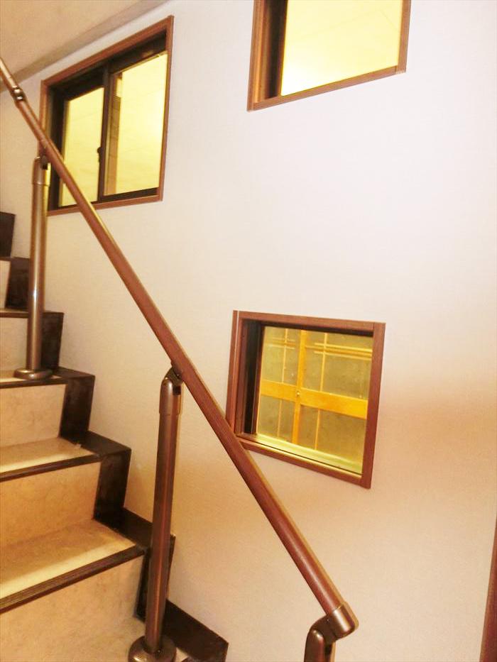 壁の窓からお部屋の明かりが漏れる優しい雰囲気の階段に